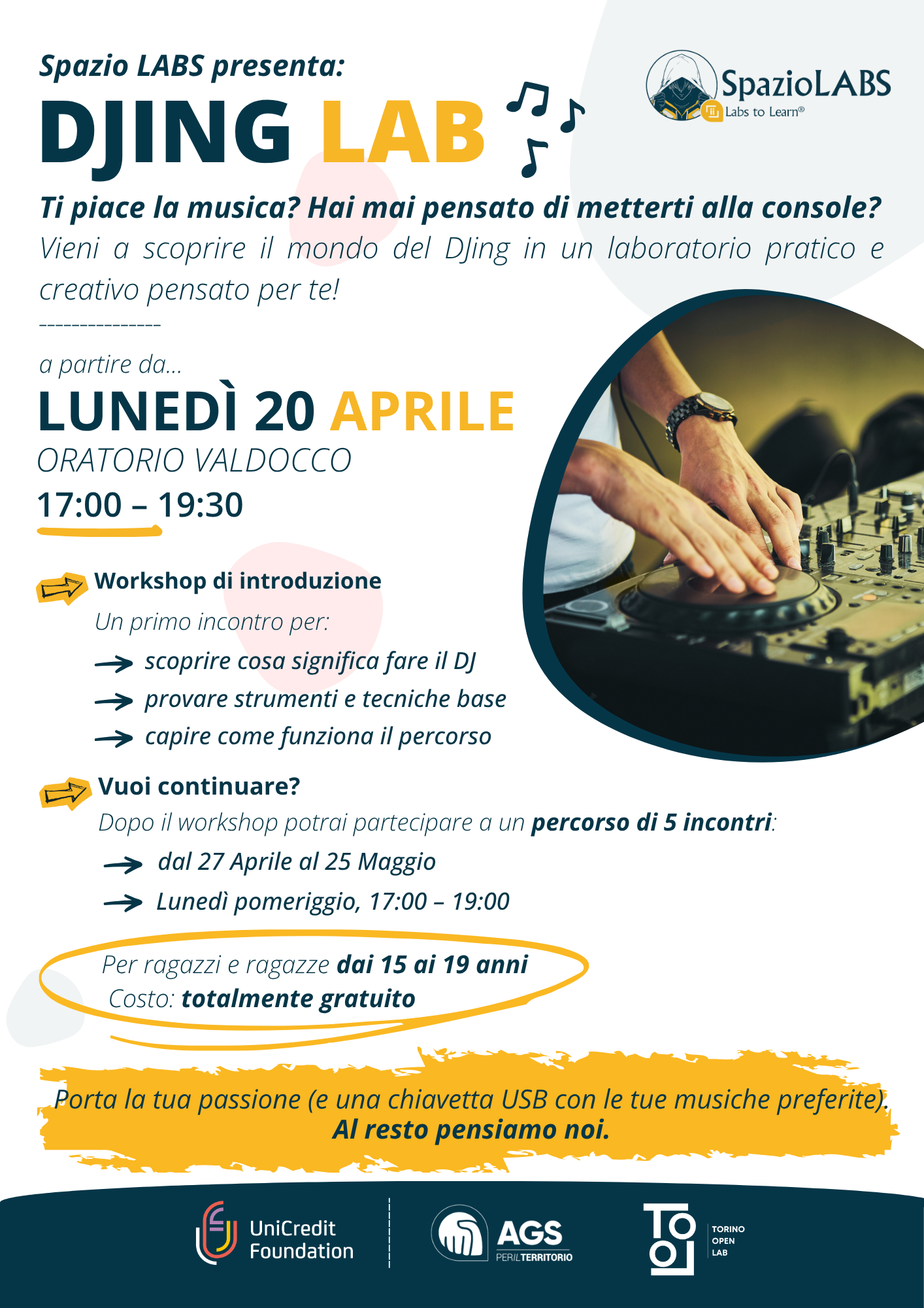 Il percorso si apre con un workshop introduttivo gratuito, in programma giovedì 20 aprile dalle 17:00 alle 19:30 presso l’Oratorio Valdocco: un’occasione per avvicinarsi al DJing, conoscere strumenti e tecniche di base e capire cosa aspettarsi dal laboratorio.